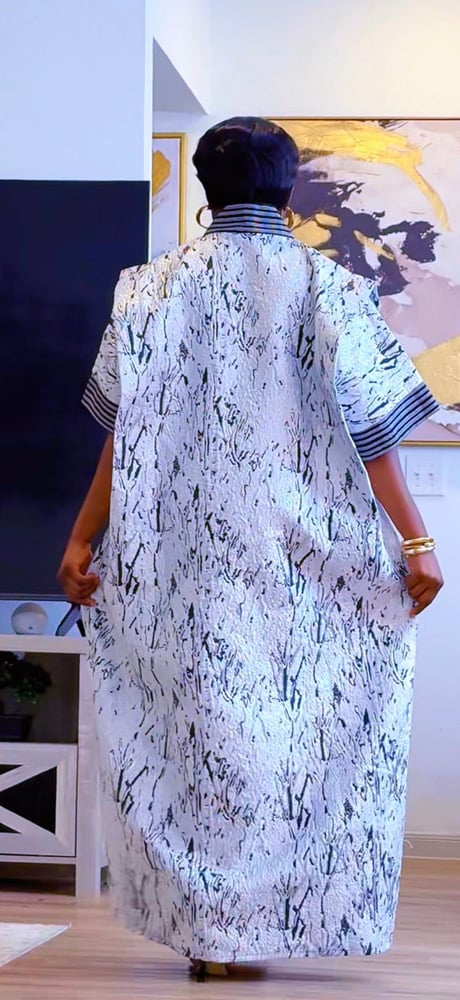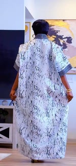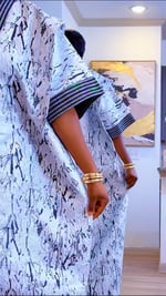 A stunning white boubou detailed with elegant black scribes, designed in a slimmer silhouette while maintaining the classic full-length flow. Finished with a refined neckline and a built-in inner belt for a smooth tummy-tuck effect, this piece offers modern shape, cultural grace, and effortless sophistication.