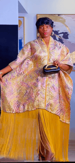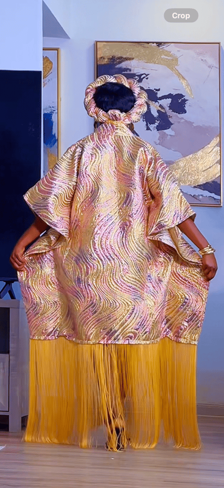 A soft, warm-toned Damask boubou stitched with gold, champagne, and rose-gold accents. The fabric catches the light gently, giving you a glowing, refined look. Finished with a long yellow fringe hem for extra movement and elegance. A perfect blend of sophistication and tradition.