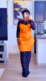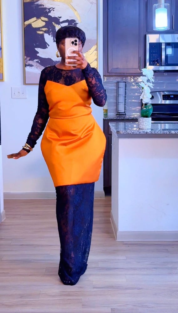 A bold two-piece dress featuring a fitted black lace inner gown paired with a vibrant orange waist-length overlay. Designed with a sleek silhouette and clean structure, this set blends elegance, color, and modern flair for any standout occasion.