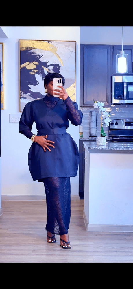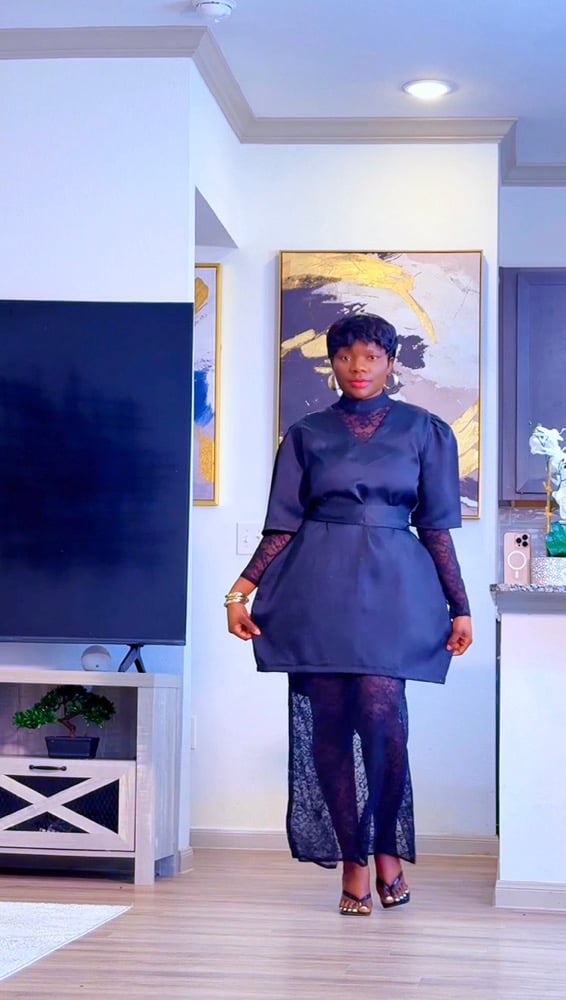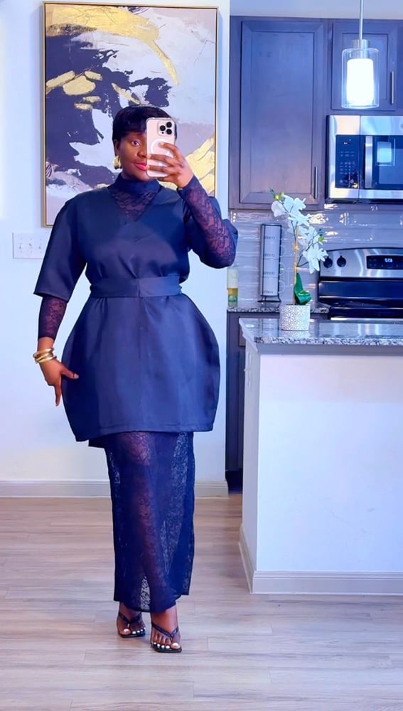 A chic two-piece black dress featuring a fitted lace inner gown paired with a waist-length structured overlay top. Finished with a matching belt to define the waist, this elegant set blends modesty, style, and modern sophistication.