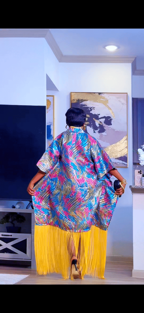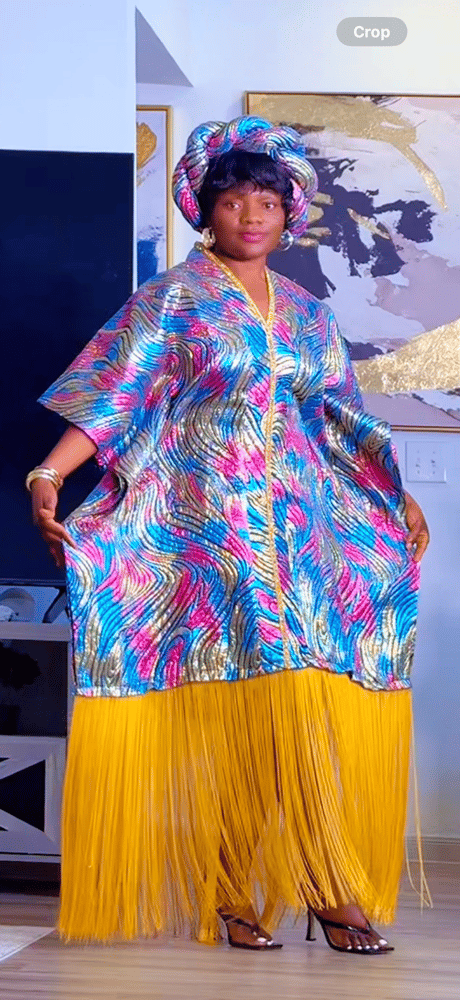 A vibrant multicolor Damask boubou blending waves of blue, pink, gold, and silver for a stunning iridescent effect. Light, flowy, and graceful with a dramatic yellow fringe hem, this piece makes you stand out the moment you walk in. Perfect for queens who love color and confidence.