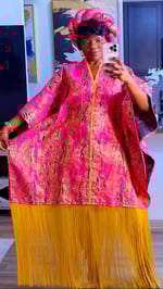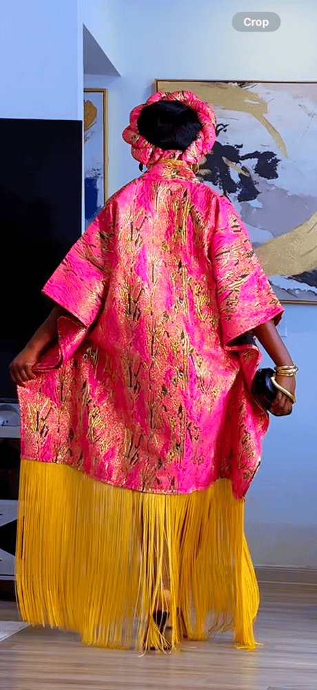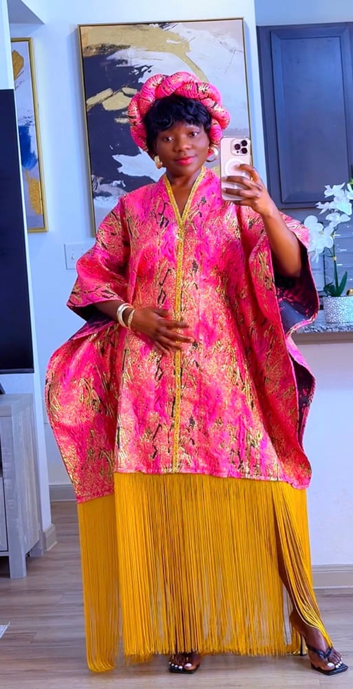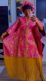 A luxurious Damask boubou crafted in rich pink with golden patterns that shimmer beautifully. Designed with a roomy, regal silhouette and finished with a bold yellow fringe hem that moves with every step. This piece brings effortless elegance, comfort, and statement style all in one.